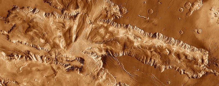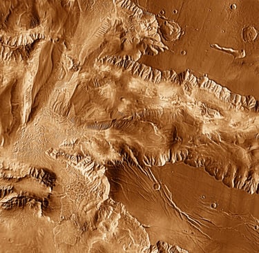 Vue d'artiste de Valles Marineris avec Melas Chasma, Candor Chasma et Ophir Chasma au premier plan.