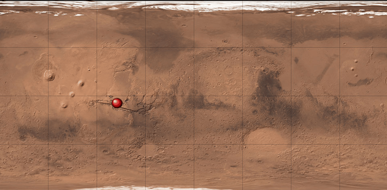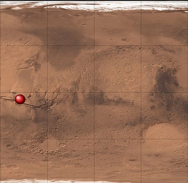 L'emplacement choisi pour la Hillside Base se situe aux coordonnées 69.95W x 6.36S dans Candor Chasma, une région du complexe de canyons de Valles Marineris.