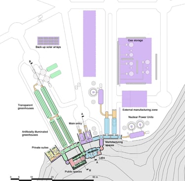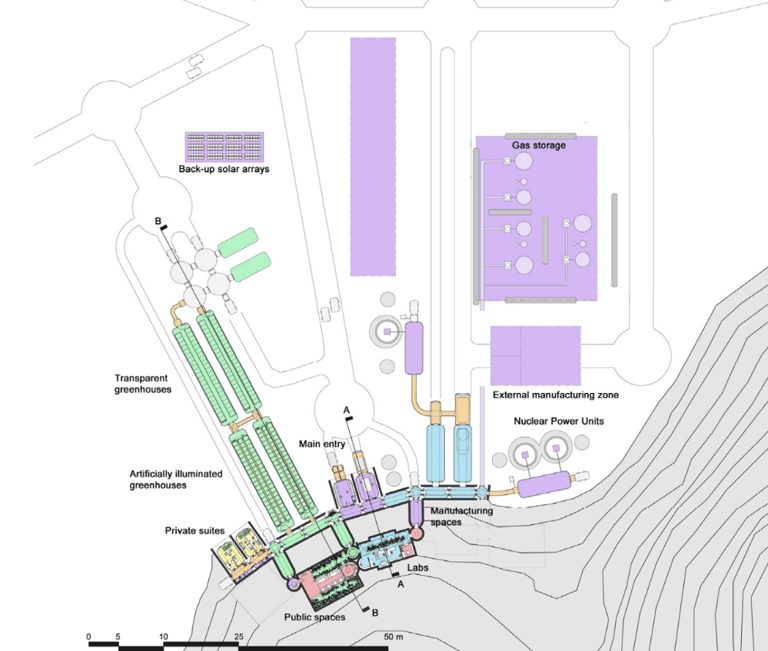 Les fonctions bruyantes de fabrication sont isolées des quartiers d'habitation, lesquels sont enterrés sous 6 à 10 mètres de régolithe pour garantir une protection passive optimale contre les radiations. La construction utilise des méthodes variées, allant des dômes en maçonnerie de briques produites localement aux cylindres rigides en fibre de verre ou en métal soudé. À titre d'exemple, la production des 2 200 mètres cubes de briques nécessaires à la phase initiale requiert environ 370 jours de fonctionnement automatisé des fours.