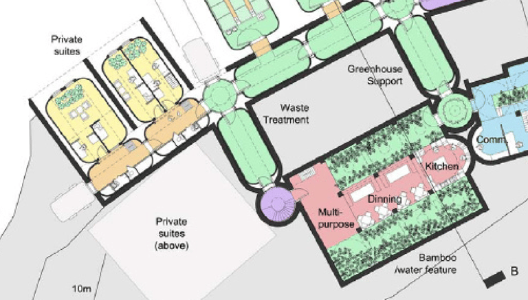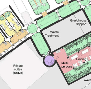 Pour transformer un habitat isolé en un véritable foyer, le projet accorde une priorité absolue à la qualité de l'environnement intérieur. La végétation est utilisée comme un pilier social et un médiateur de l'espace ; des arbres sont plantés dès l'arrivée des premiers colons pour symboliser l'espoir et la permanence de l'établissement. Les plantes servent également à masquer les limites physiques des structures souterraines grâce au concept de « jardin chinois », créant une illusion d'espace plus vaste et réduisant le sentiment de confinement. L'apport de lumière naturelle est assuré par des puits de lumière (lightpipes) équipés de lentilles en surface qui dirigent les rayons solaires vers les zones communes enterrées. Les serres, outre leur rôle de support de vie, sont conçues avec de longues lignes de vue pour permettre aux résidents de marcher ou de courir, répondant ainsi à des besoins psychologiques fondamentaux.