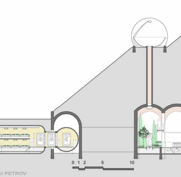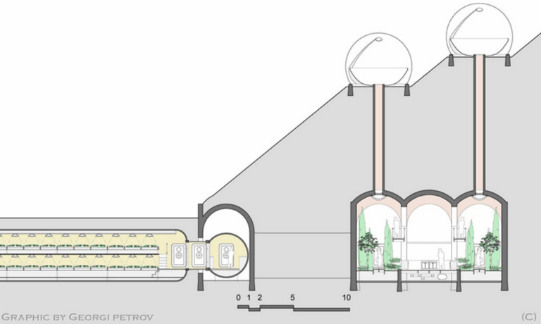 Vue d’une base avec une serre, une structure gonflable au centre et un bâtiment enterré, avec des capteurs de lumière.