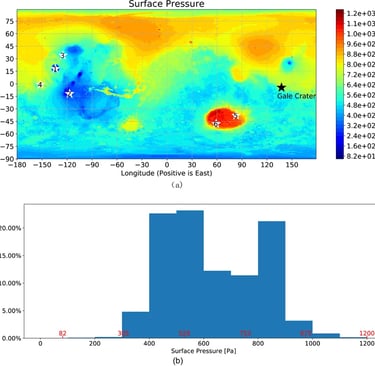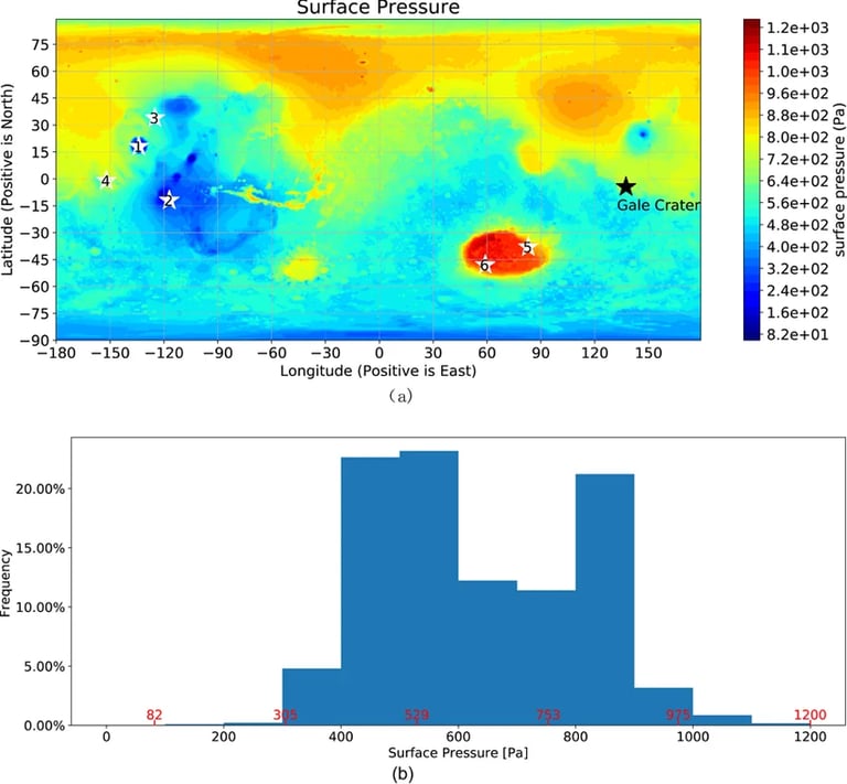 Distribution de la pression de surface sur Mars : cartographie globale et histogramme de fréquence